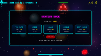 - Upgrade shop — Fire Rate, Speed, Damage, Shield, and Crit Chance